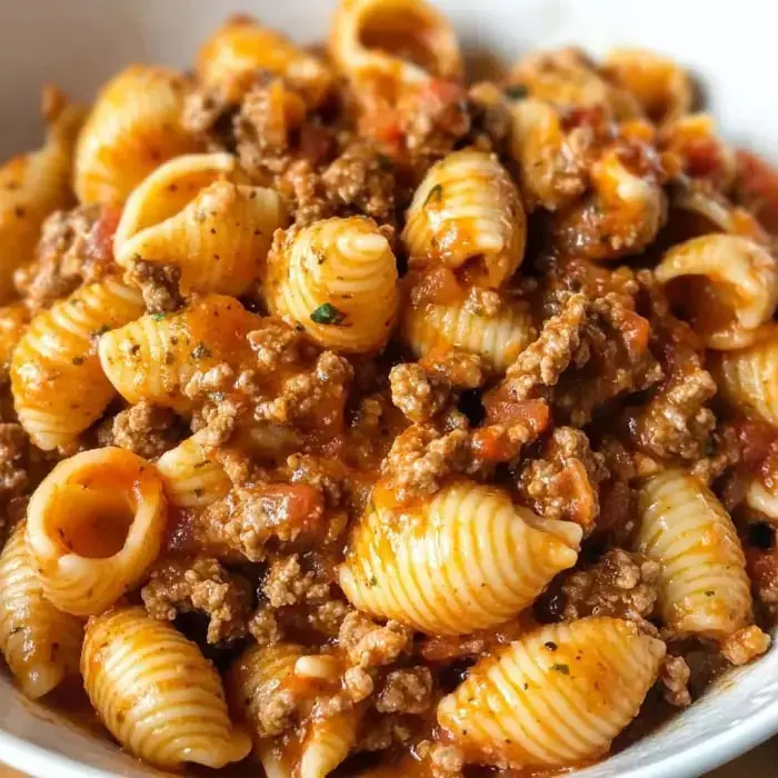 Classic beefaroni with ground beef, macaroni, and creamy tomato cheese sauce for a comforting meal.
